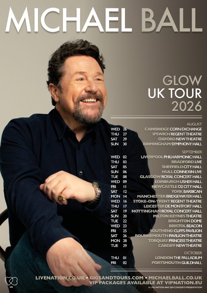 MUSICAL star and radio and TV presenter Michael Ball will promote his 23rd solo album, Glow, on next year’s 25-date tour. “There’s probably only one thing I enjoy more than being in the studio – writing, producing and singing songs with people I love – and that’s taking it all out on the road and performing those songs as well as all the old favourites to the audiences I love,” he says. “It’s going to be an exciting year, and I can’t wait to see you all.’’ Box office: https://www.yorkbarbican.co.uk/whats-on/michael-ball-2026/.