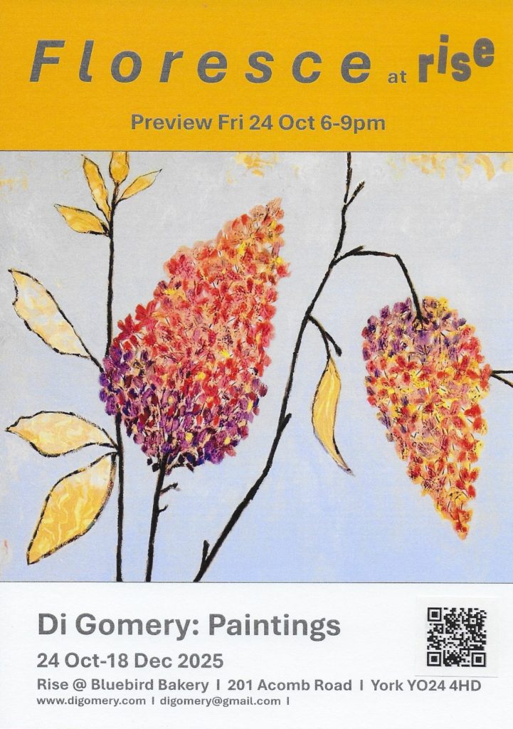 Di Gomery’s poster for her Floresce exhibition at Rise@Bluebird Bakery, Acomb
