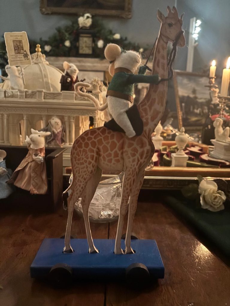 A tall order for a mouse jockey, taking a giraffe for a ride in A Christmas Mousequerade