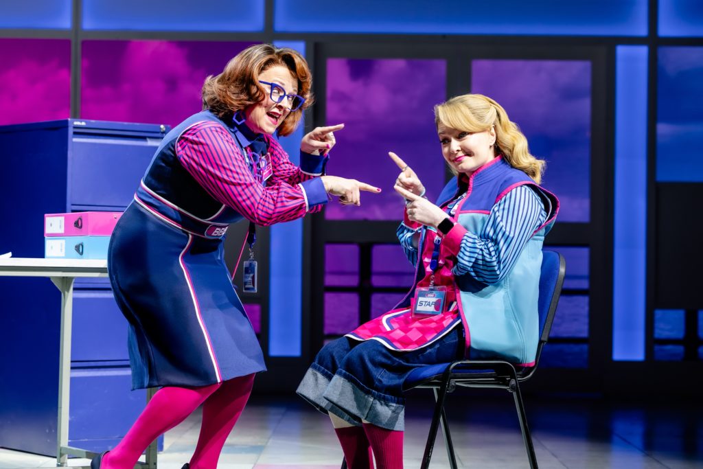 Sally Ann Matthews’ supermarket boss, Patricia, left, with Lara Dennning’s Caz in Here & Now: The Steps Musical. Picture: Danny Kaan
