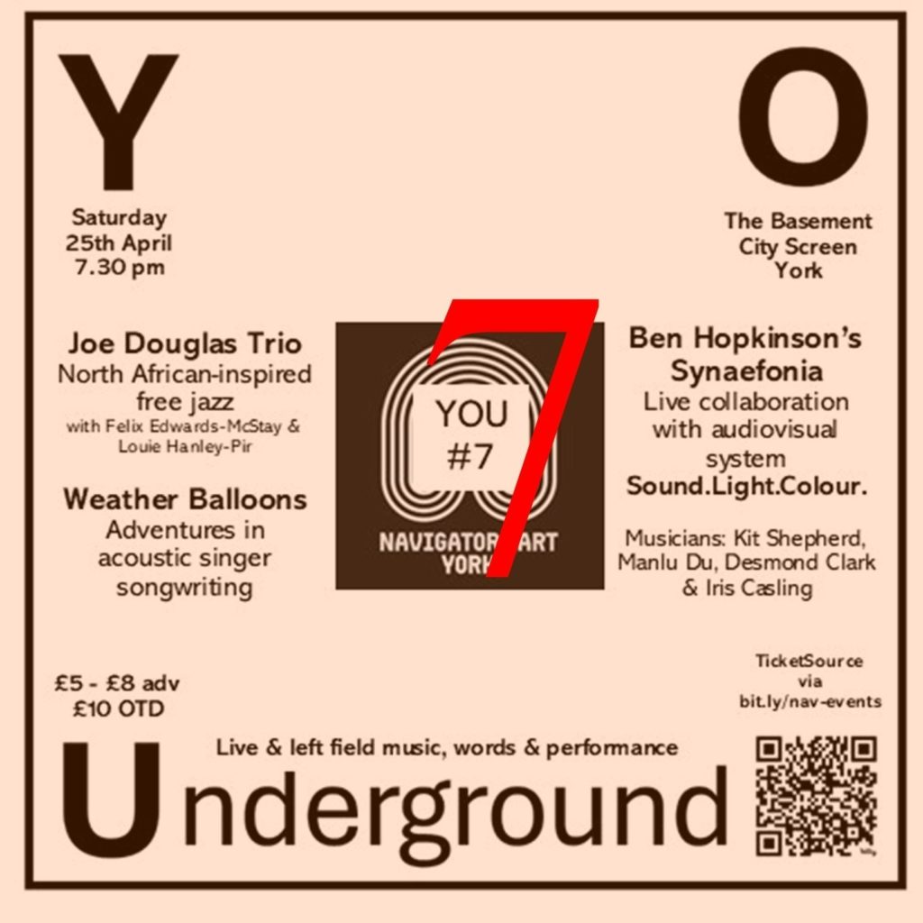 CONTINUING its mission to present adventurous left-field music and words from York and the region, Navigators Art plays host to an eclectic mixed bill of uniquely styled indie acoustic song-writing from Weather Balloons, the Joe Douglas Trio’s North African-inspired free jazz and a collaboration between audiovisual projections and Ben Hopkinson’s quartet Synaefonia.