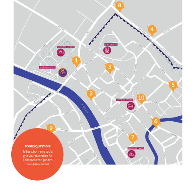 Find all ten Nutcrackers and collect their names on your trail map to enter the prize draw for a £250 York Gift Card. That’s not all: by answering the bonus question, you could win an art hamper filled with MarcoLooks goodies.