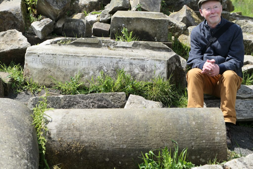 Professor Peter Burman seated by “Perspective Is The Temple Of Decision” in 2019