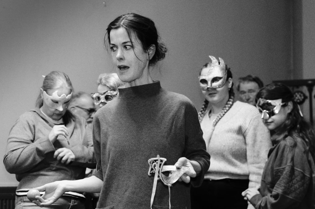 Lara Stafford’s Anne Boleyn, with the masked ladies of the Tudor court behind her, in rehearsal for Black Treacle Theatre’s Anne Boleyn. Picture: Paul Hutson