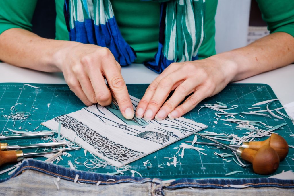A close-up of Michelle Hughes carving a linocut. Picture: Jackson Portraiture