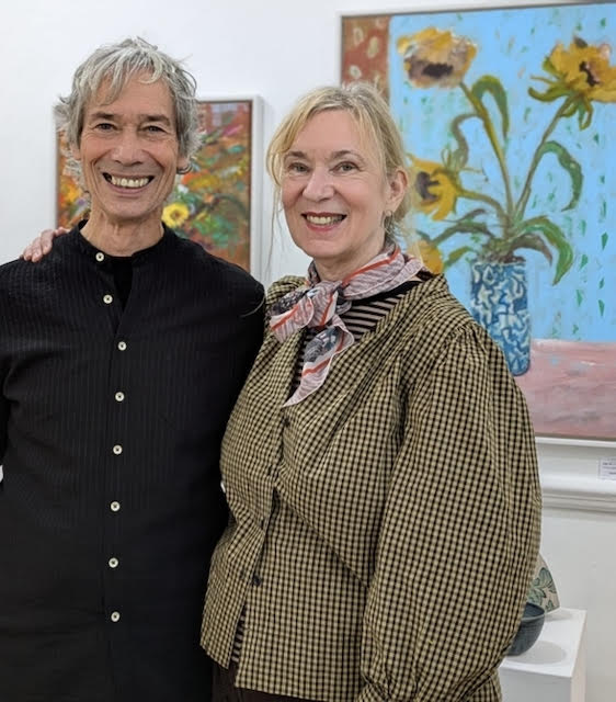 Lesley Birch at her Flower Power exhibition opening with Pyramid Gallery owner and curator Terry Brett