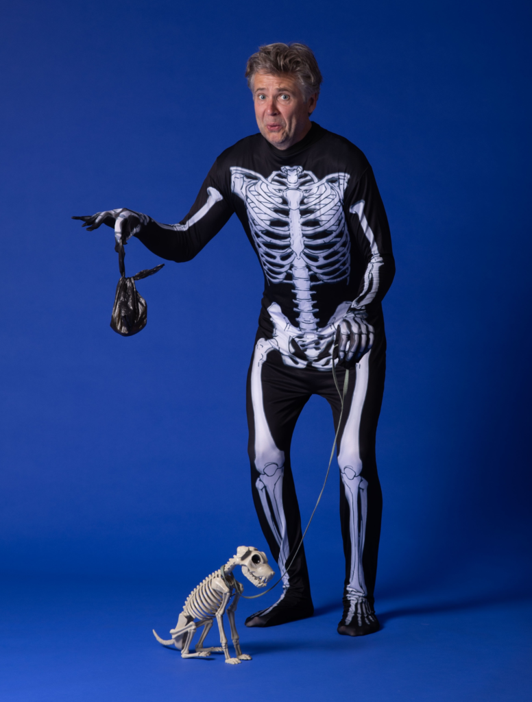 Super-scooper: Rob Rouse going walkies with his skeletal dog in Funny Bones at Pocklington, Helmsley and Scarborough