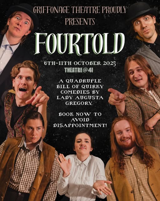 Griffonage Theatre’s poster for FourTold, starring Katie Leckey as The Magistrate, Mr Hazel and Darby; Ben Koch as James Ryan, Hyacinth Halvey and Taig; Wilf Tomlinson as Shawn Early and James Quirke; Emily Carhart as Mrs Fallon and Jo Muldoon; Helen Clarke as Bartley Fallon and Mrs Delane; Grace Palma as Mrs Tarpey and Phoebe Farrell; James Lee as Mrs Tully, Mr Mineog and Miss Joyce and Peter Hopwood as Jack Smith