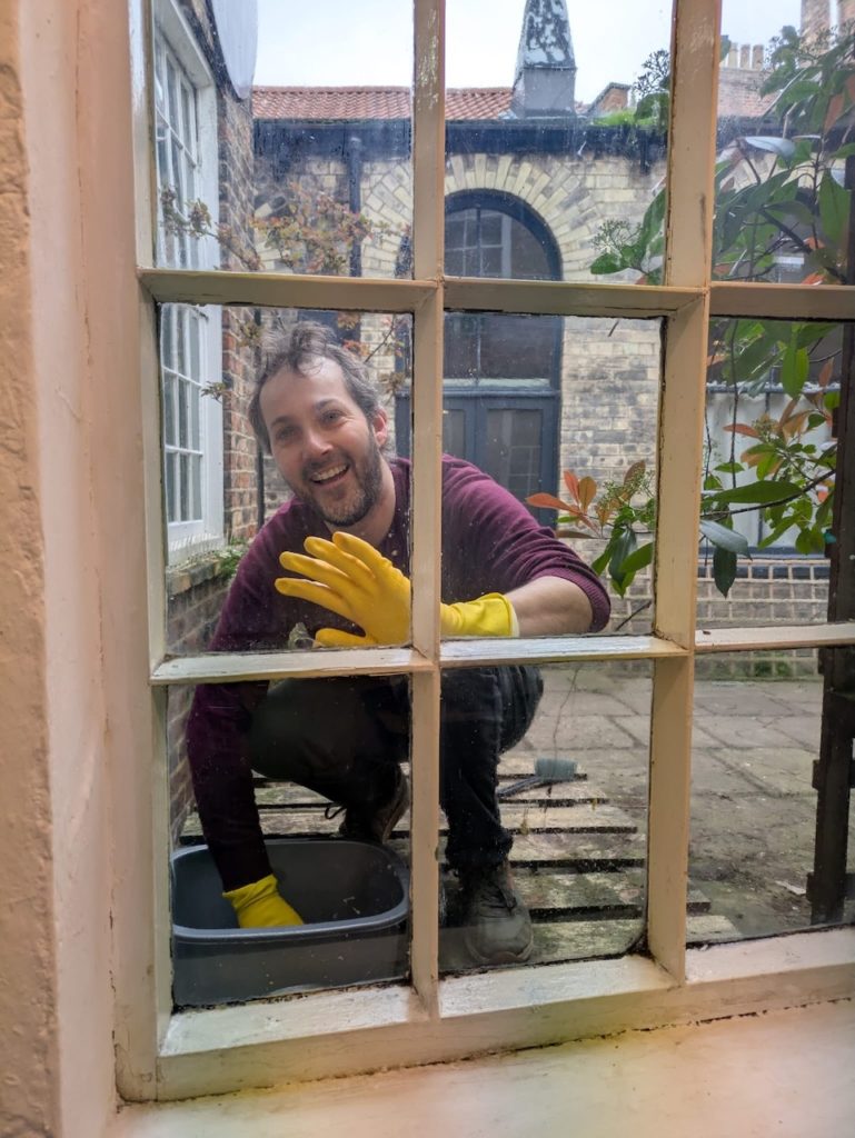 Out with the old: Artist Ric Liptrot turns his hands to cleaning windows as part of the clear-out at Grape Lane