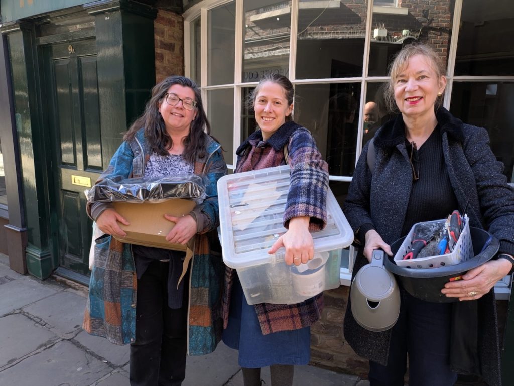 PICA Studios artists Sarah Jackson, left, Emily Stubbs and Lesley Birch carrying the last items out of the Grape Lane studio