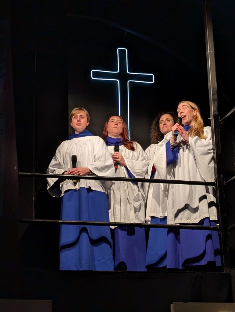 To either side of the screen on the mezzanine level is a neon-lit cross; on one occasion up there, Clay’s Geraldine tells one of her shaggy dog tales to Poskitt’s Alice Tinker, the ditzy church verger, but the lighting puts a distracting shadow slash across the vicar’s face from the barrier railing. Hopefully that can be eradicated.