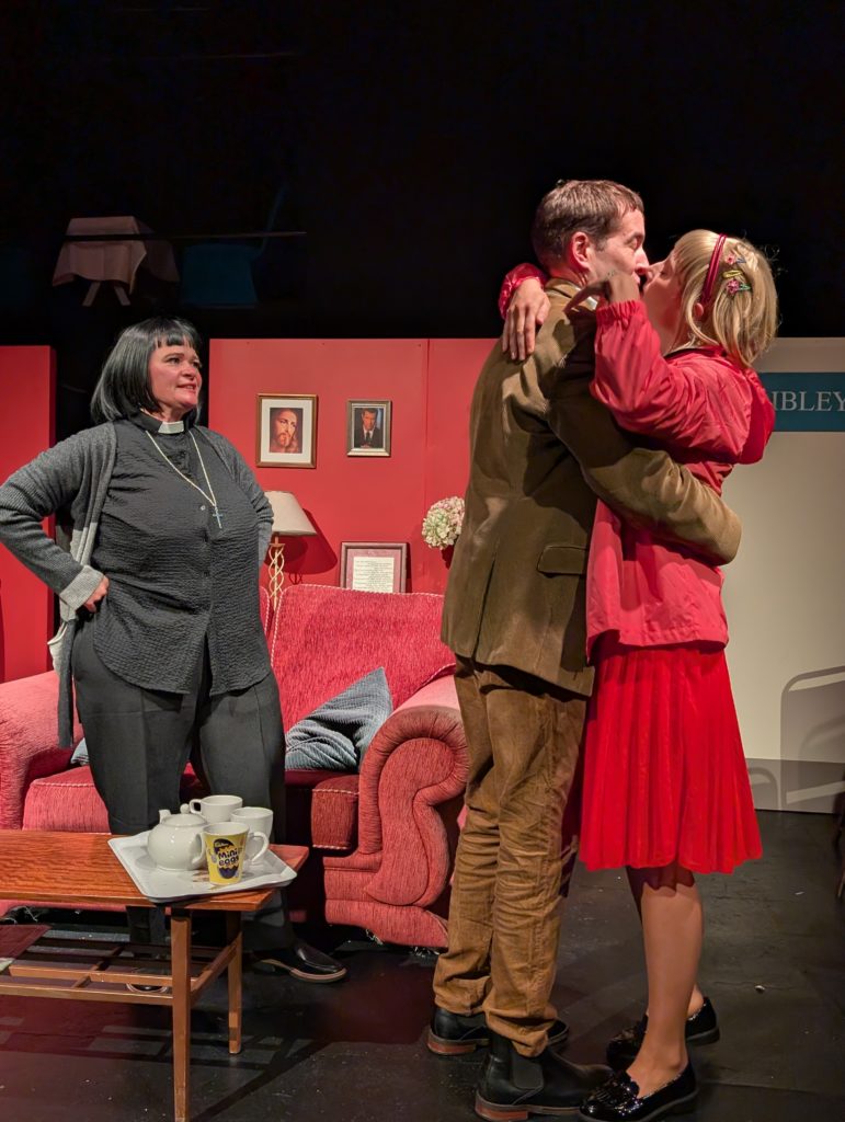 Nicki Clay’s Geraldine Granger looks on as Neil Foster’s Hugo Horton and Florence Poskitt’s Alice Tinker kiss at last in MARMiTE Theatre’s The Vicar Of Dibley. Picture: Paul Miles