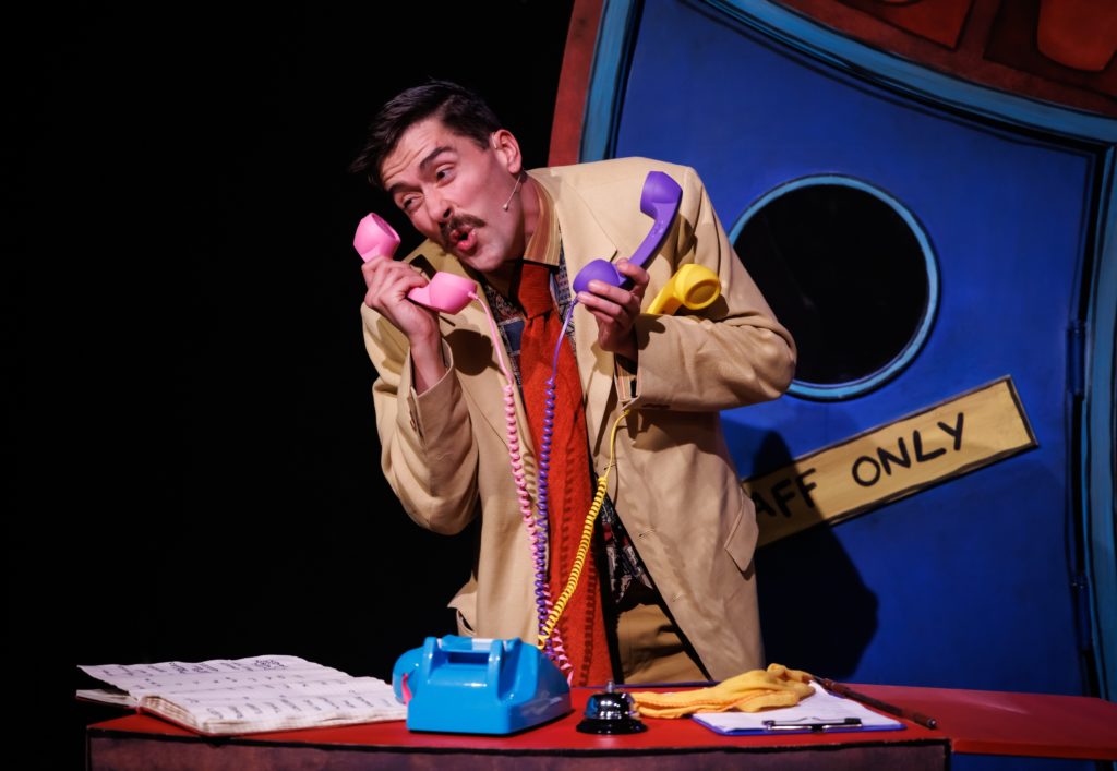 Caitlin Mawhinney’s set is colourful and playful. The Spa sign is a loose-fitting add-on for a new facility, sure to fall off; the manager’s desk revolves around the stage at pace; the phone is sky blue, old-fashioned, but with a modern ring tone for the children to recognise. In the tradition of farce, two doors are in constant use; the cupboard ones even more so.