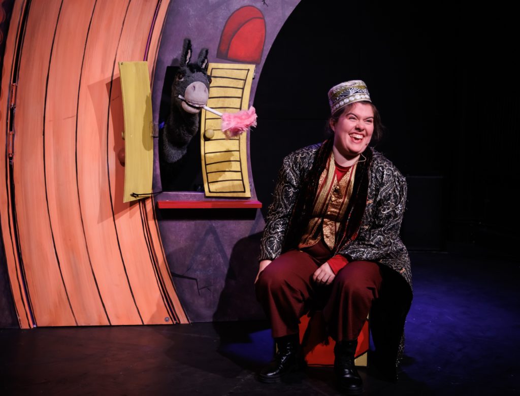 Writer Price is alive to the power of puppetry and pooping noises being guaranteed to bring the young house down, and how they laugh at a cheeky donkey popping out of the myriad cupboards doors to bite More on the backside or grab and eat his bookings diary. The more the donkey does so, the louder the laughs grow. Likewise, the squelching boots of Coen’s shepherd are irresistibly comical, the more she walks.
