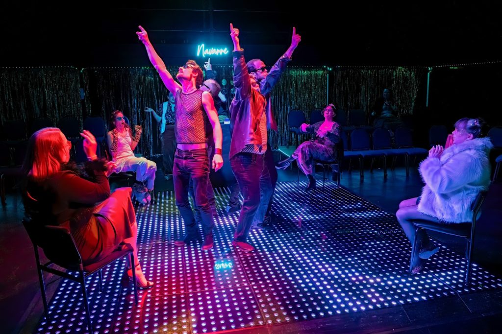 We first encounter them flat out, hung over, slumped on the Navarre dance floor after one heck of a party hosted by Tempest Wisdom’s Moth, the club DJ with a licence to ad-lib. The audience had arrived to the sight of all the cast cutting the rug amid the ever-changing floor lights, as they took up their seats on the perimeter, seats that will be occupied by cast members on occasion too for moments of direct address, all adding to the highly energetic production’s “immersive tag.