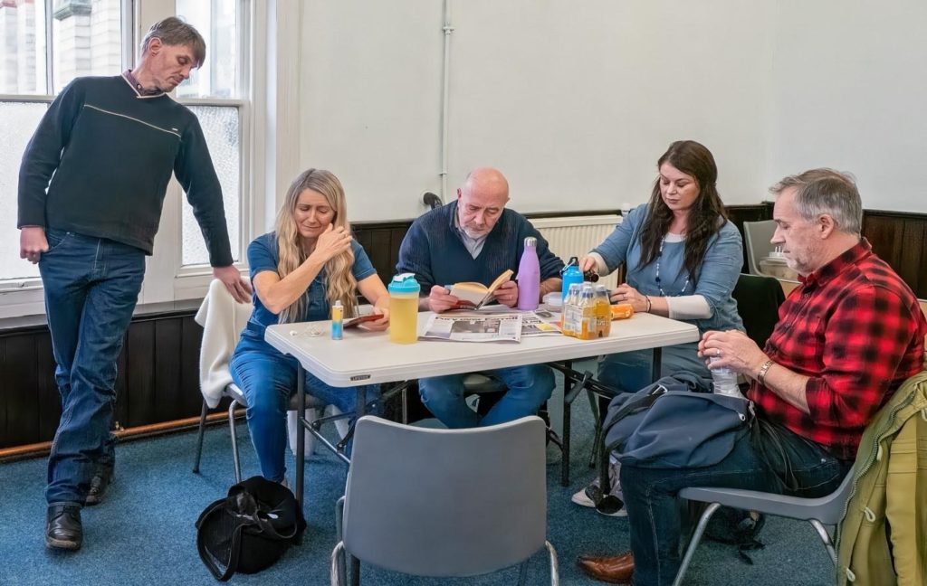 Neil Vincent, left, Clare Halliday, Chris Pomfrett, Victoria Delaney and Mick Liversidge in rehearsal for York Actors Collective’s February production of Beyond Caring
