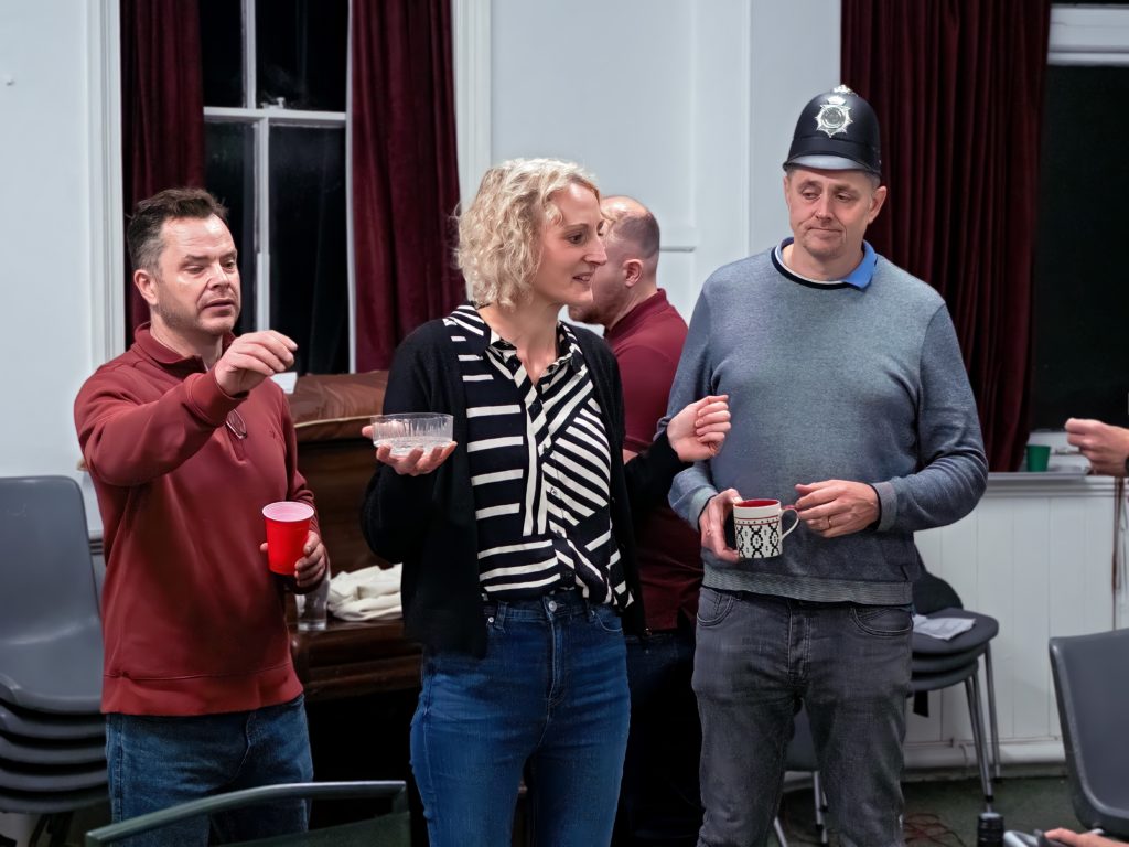 David Barrott, Catherine Edge and Adam Marsdin in rehearsal for Settlement Players’ production of Party Piece